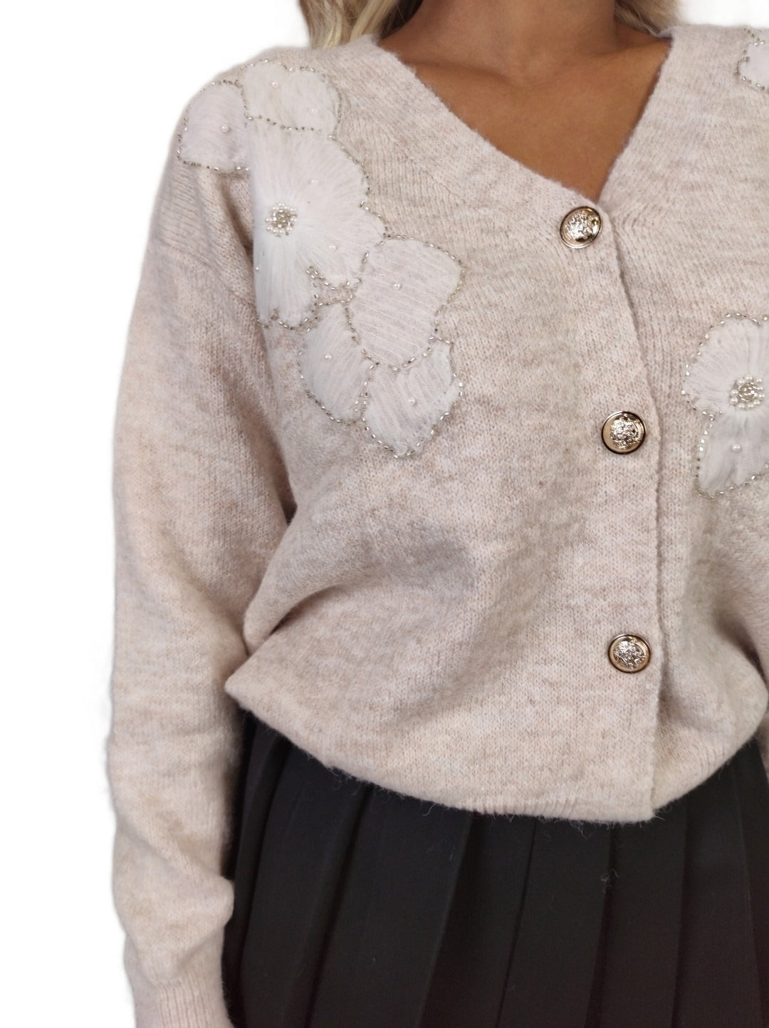 cardigan beige- con decoro bianco e bottoni argentati